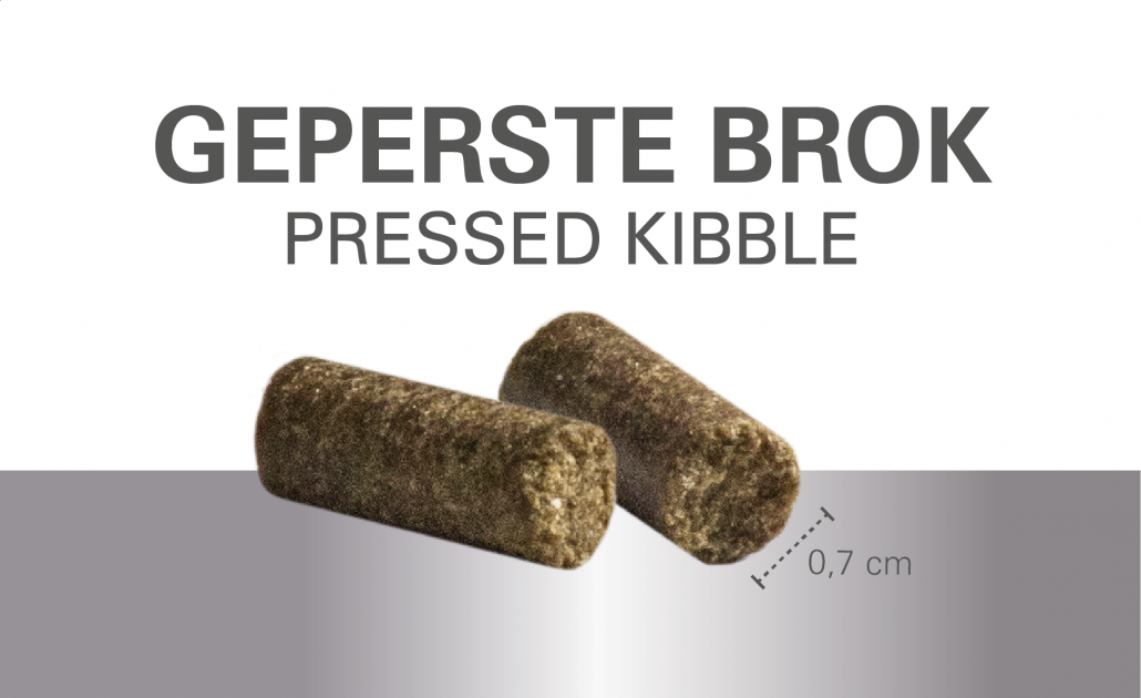 B. When you are switching your pet from extruded (expanded) kibble to one of Prins’ pressed varieties, we recommend an instant changeover instead of a period of mixing. Occasionally switching to another food may result in slightly different feces. However, this is completely harmless. You could also opt for switching using frozen raw meat (see switching guideline section C). Pressed kibble is a condensed food with less volume than the extruded type. The recommended portions are therefore smaller, making this food easier on the stomach.