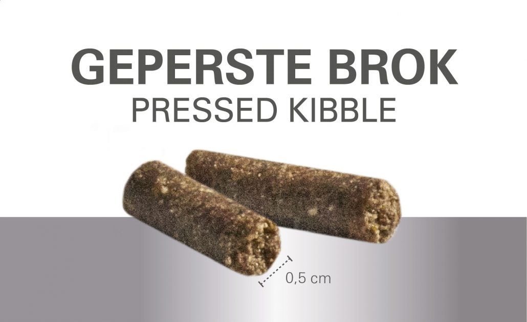 B. When you are switching your pet from extruded (expanded) kibble to one of Prins’s pressed varieties, we recommend an instant changeover instead of a period of mixing. Occasionally switching to another food may result in slightly different feces. However, this is completely harmless. You could also opt for switching using frozen raw meat (see switching guideline section C). Pressed kibble is a condensed food with less volume than the extruded type. The recommended portions are therefore smaller, making this food easier on the stomach.
