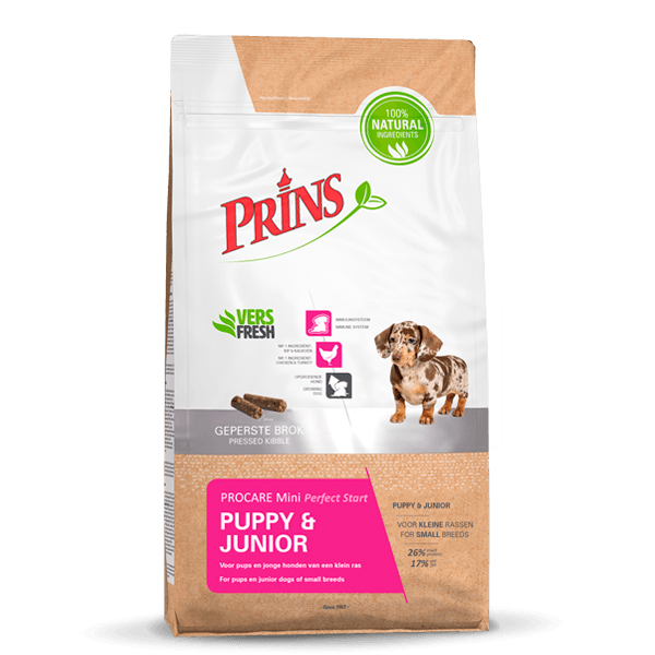 For puppies and junior dogs of small breeds. ProCare Mini Puppy & Junior Perfect Start is a pressed food especially for puppies and junior dogs of small breeds, from 4 weeks to around 12 months. This complete food contributes to healthy growth, an effective immune system and optimal development of bones and joints. Your puppy will develop in a well-balanced way as it grows into adulthood.